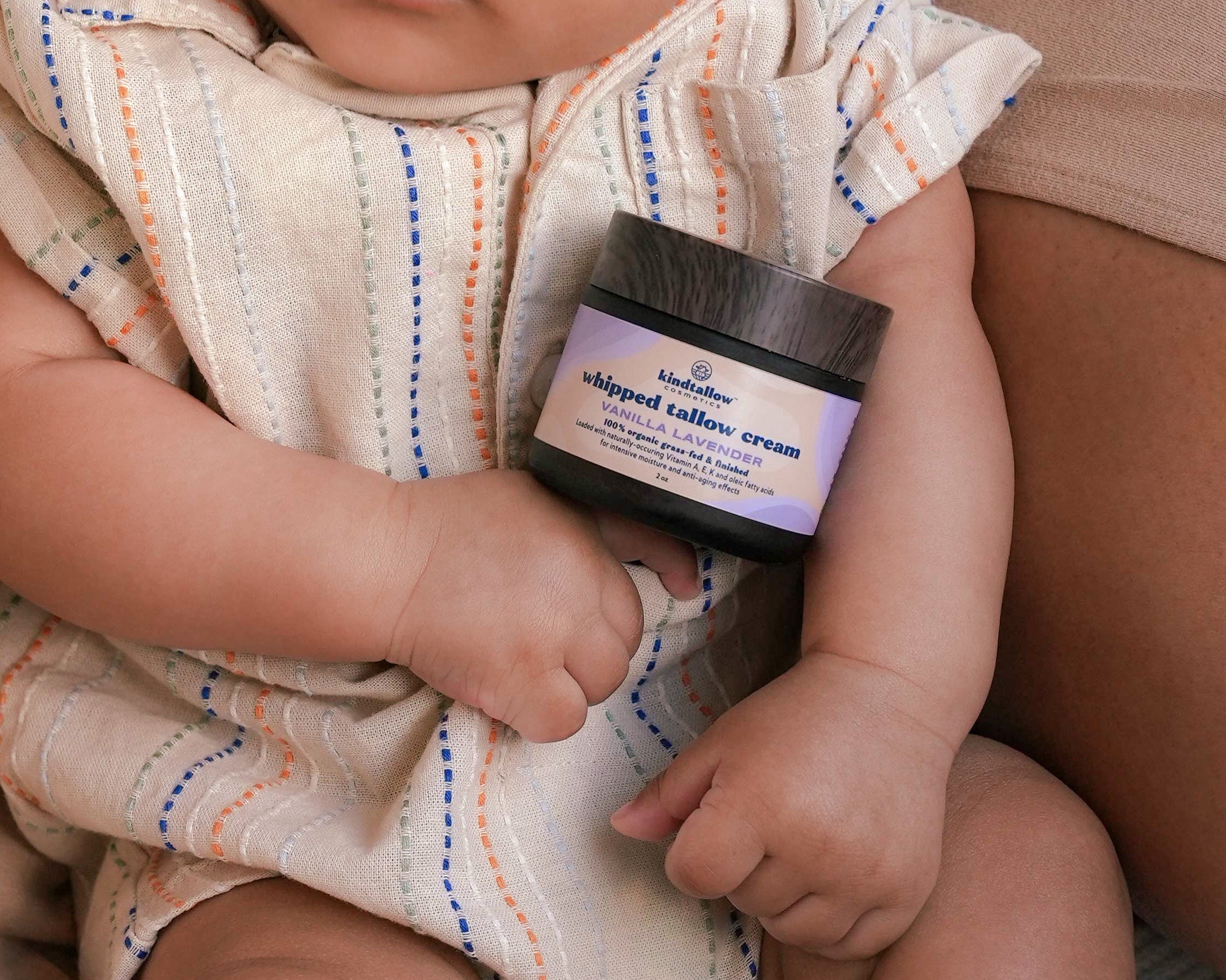 Not sure if essential oils are right for you or your baby? We recommend our Unscented Original Tallow Cream with just 2 ingredients - 100% organic, grass-finished beef tallow, and high quality cold-pressed jojoba oil.