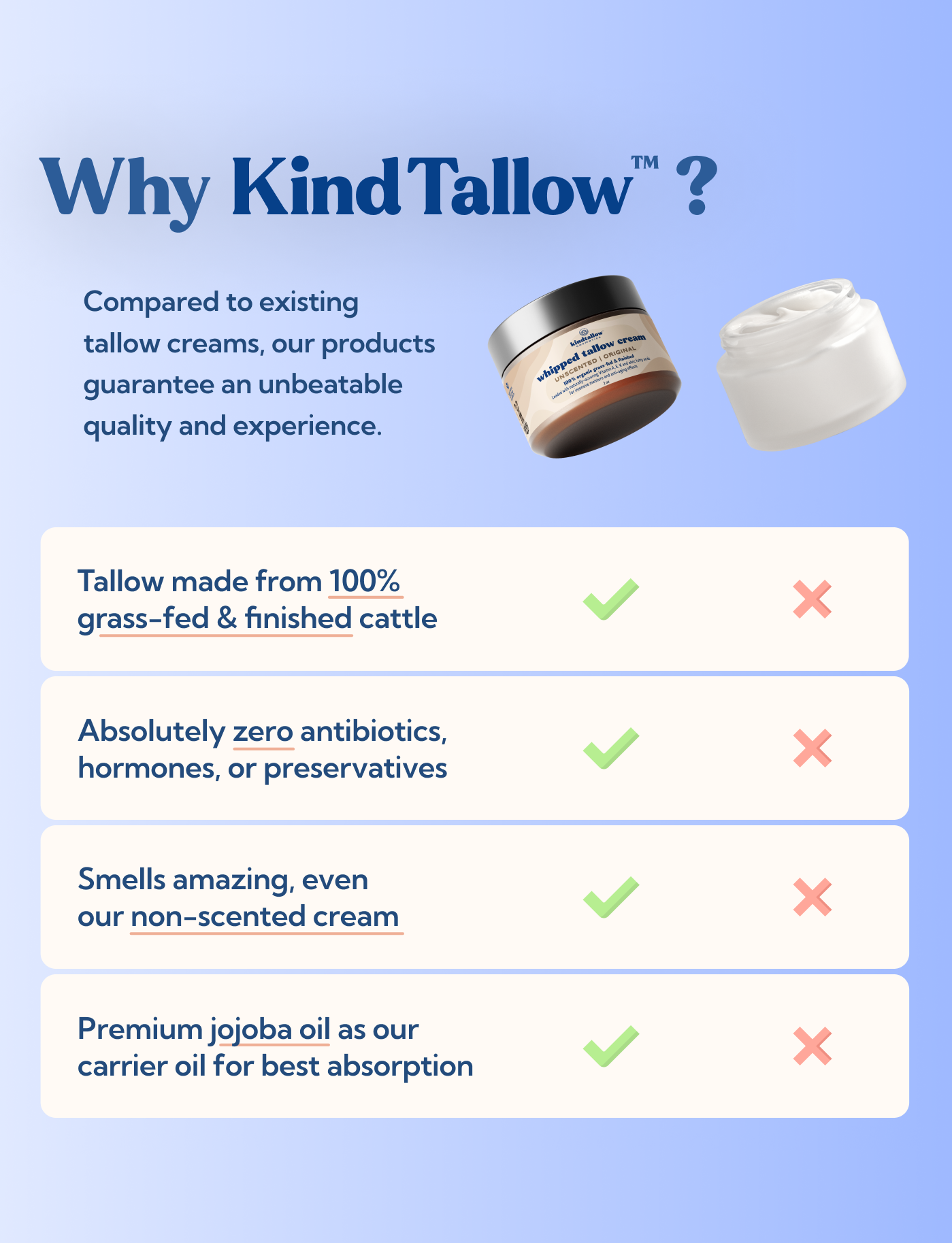 1. Extreme compatibility: Tallow cream stands out due to its natural compatibility with human skin. Due to the similar molecular structure, tallow cream is highly compatible as it mimics our natural sebum, effectively locking in moisture and nutrients without clogging pores.